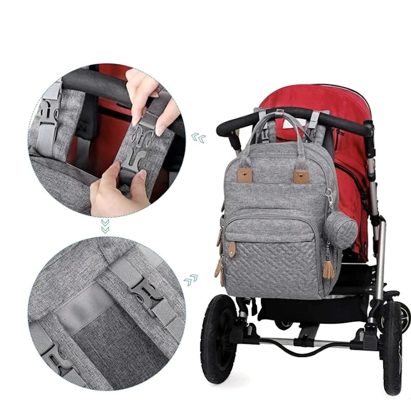Conforto e Praticidade: Alças largas e macias tornam o transporte mais confortável, enquanto o design em camadas da bolsa interna facilita o acesso aos itens essenciais. Com um gancho de carrinho incluso, suas mãos ficam livres para aproveitar momentos preciosos com seu bebê.