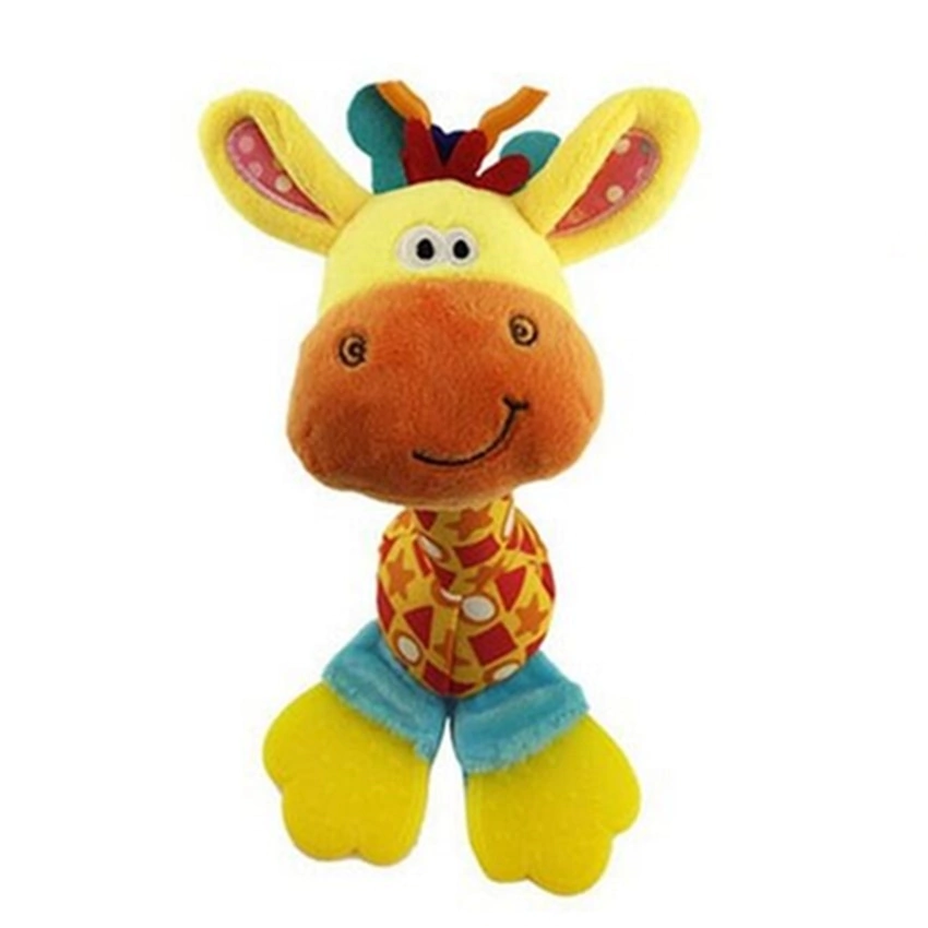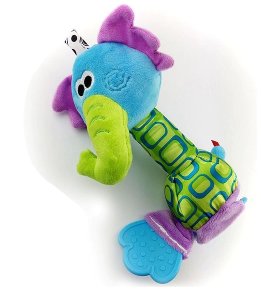 O Chocalho de pelúcia com mordedor para bebês, macio e colorido, um brinquedo interativo, com sininho e mordedor de silicone com texturas, com cores brilhantes e em forma de Animal.
