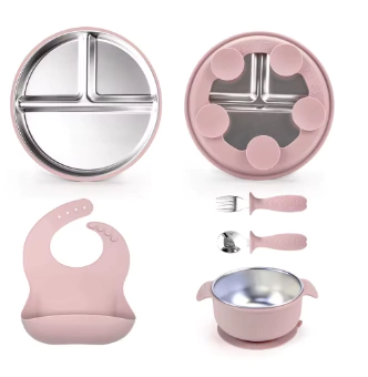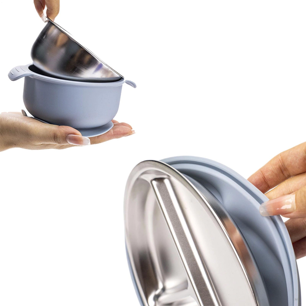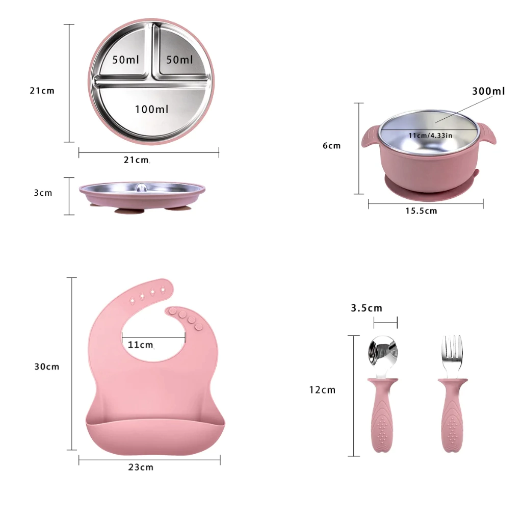Torne as refeições do seu bebê mais seguras, práticas e divertidas com o Kit Alimentação Infantil em Silicone e Aço Inoxidável!