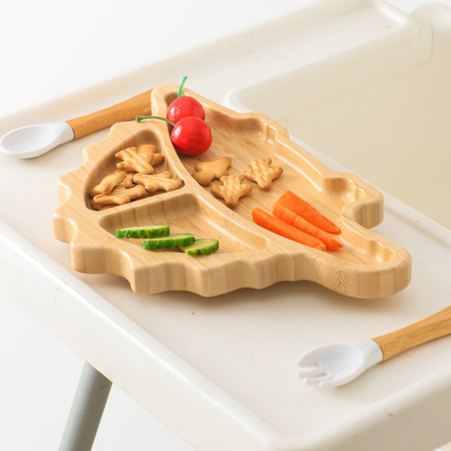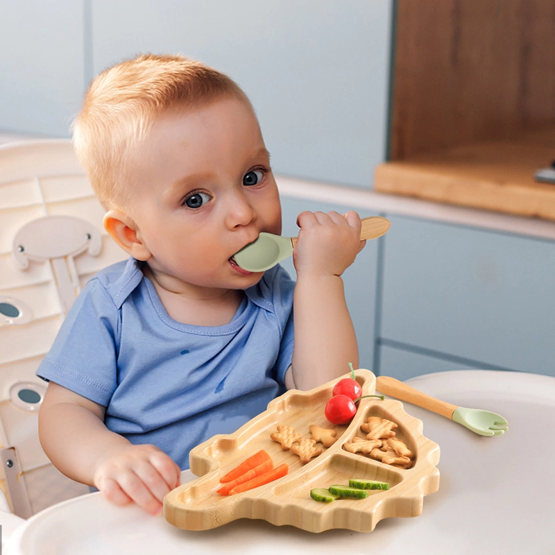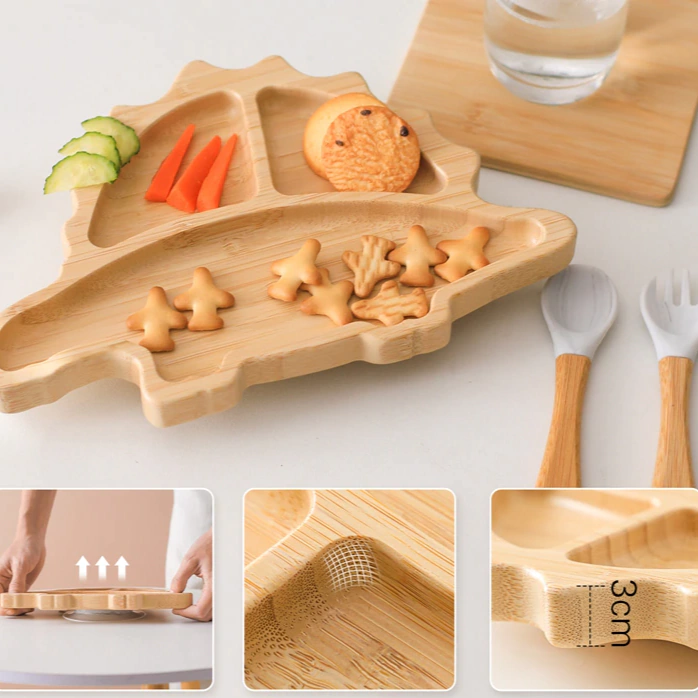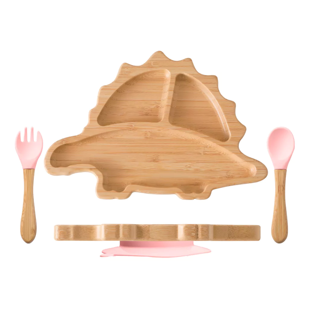 O bambu é um material muito procurado papais ultimamente, por ser pela limpeza fácil e possuir agentes antimicrobianos naturais. Olha que lindo esse conjuntinho com o pratinho em formato de dinossauro.