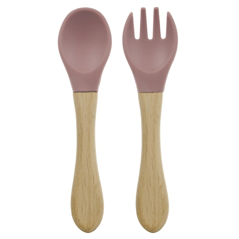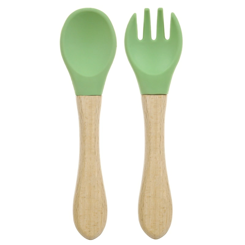 A colher e garfo de silicone com cabo de madeira foram desenhados para serem ergonomicamente ajustáveis à mão da mamãe e do bebê. Leves de segurar, possuem suas pontas de silicone, essenciais para evitar que o bebê se machuque ao usá-los.